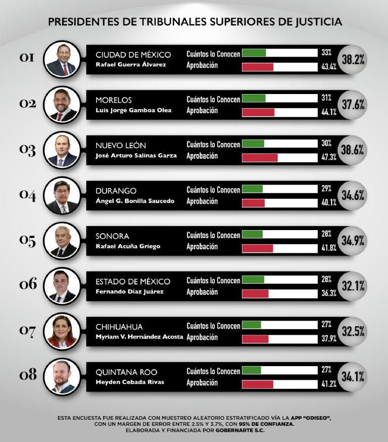 El primer lugar lo ocupa el Magistrado Rafael Guerra Álvarez, presidente del TSJ de la Ciudad de México y actual titular de la Comisión Nacional de Tribunales Superiores de Justicia (CONATRIB), seguido por José Arturo Salinas Garza de Nuevo León y Gambóa Olea de Morelos.