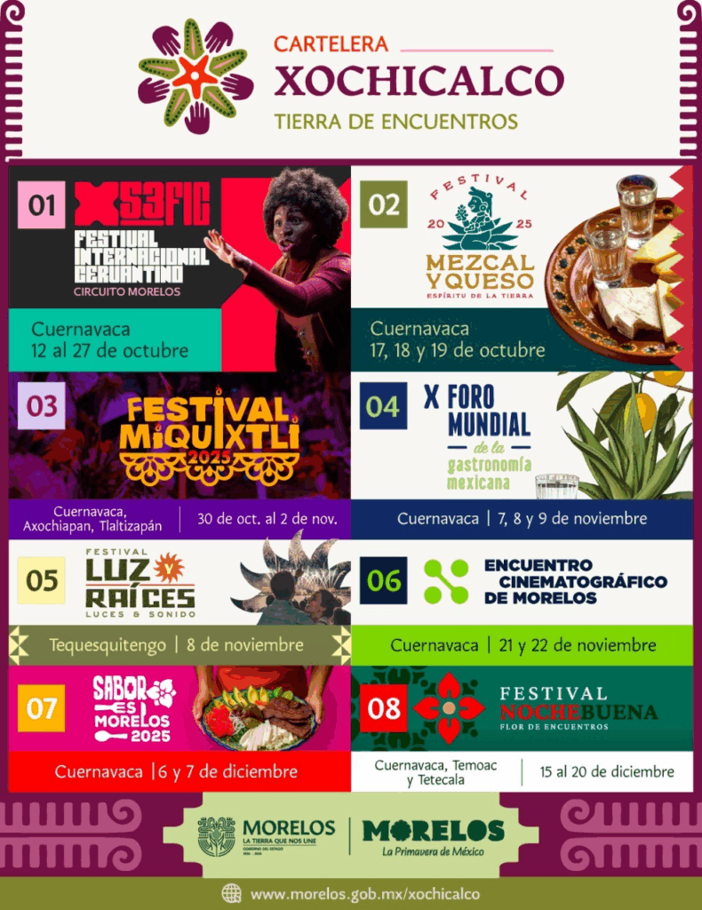 La cartelera contempla eventos de alto impacto durante el último trimestre de 2025, con actividades que articulan sectores productivos, comunidades y expresiones artísticas. Entre los encuentros destacan el Festival del Mezcal y el Queso (17 al 19 de octubre), la participación en el Festival Internacional Cervantino (12 al 27 de octubre), el tradicional Miquixtli (30 de octubre al 2 de noviembre), el X Foro Mundial de la Gastronomía Mexicana (7 al 9 de noviembre), y el espectáculo Luz y Raíces en Tequesquitengo (8 de noviembre).